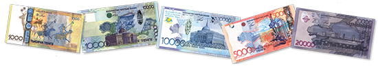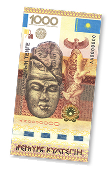 Kazakhstan’s current series of banknotes carries a common theme. The front includes a gilded figure of the mythical bird Samruk atop Astana’s Kazakh Eli monument, meant to depict the country’s desire to develop and prosper. Each note features doves, a universal symbol of peace, on the front; various depictions of national landmarks appear on the back. All notes carry images of the state flag and emblem and are printed in Kazakh and Russian.