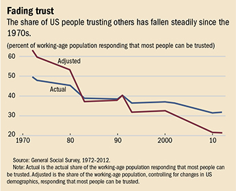 The decline in trust and social capital is troubling not only because of its effects on social cohesion; it may also have economic implications. A substantial body of literature in cultural economics shows that trust is a key ingredient for good economic performance.
