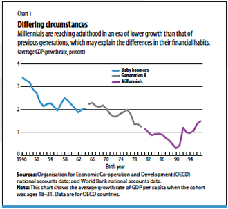 Saving for retirement: The retirement landscape has changed dramatically since baby boomers started to enter the labor market in the mid-1960s. In the United States, employers (particularly those in the private sector) have increasingly switched from generous defined-benefit pension plans, with employer-provided guaranteed retirement income, to defined-contribution account pensions, for which the burden of saving for and managing retirement wealth and income falls on employees’ shoulders during their working years and in retirement. In other parts of the world, rapidly aging populations have led many countries to undertake reforms to their public pensions, which have generally reduced their overall generosity. Millennials thus have greater responsibility for managing and growing their retirement savings and greater uncertainty about how much wealth and income they will be able to live on in retirement. (See “Pension Shock,” in this issue of F&D.)