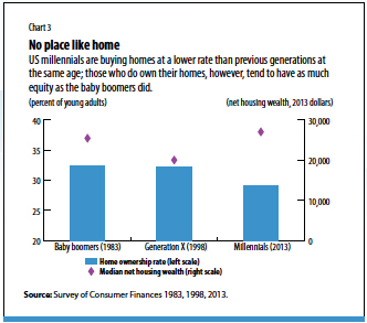 However, young adults in the United Kingdom, the United States, and Europe have experienced declining home ownership rates. Millennial home ownership rates are nearly 3 percentage points, or 10 percent, lower than those of their baby boomer and Generation X counterparts at the same age (see Chart 3). For millennials who have purchased a home, however, net housing wealth (the value of the home, minus mortgage debt) is about the same as that of their baby boomer parents at the same age.