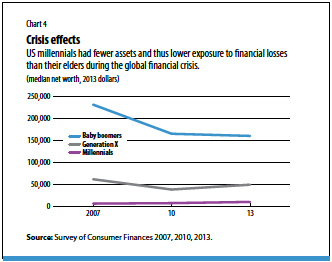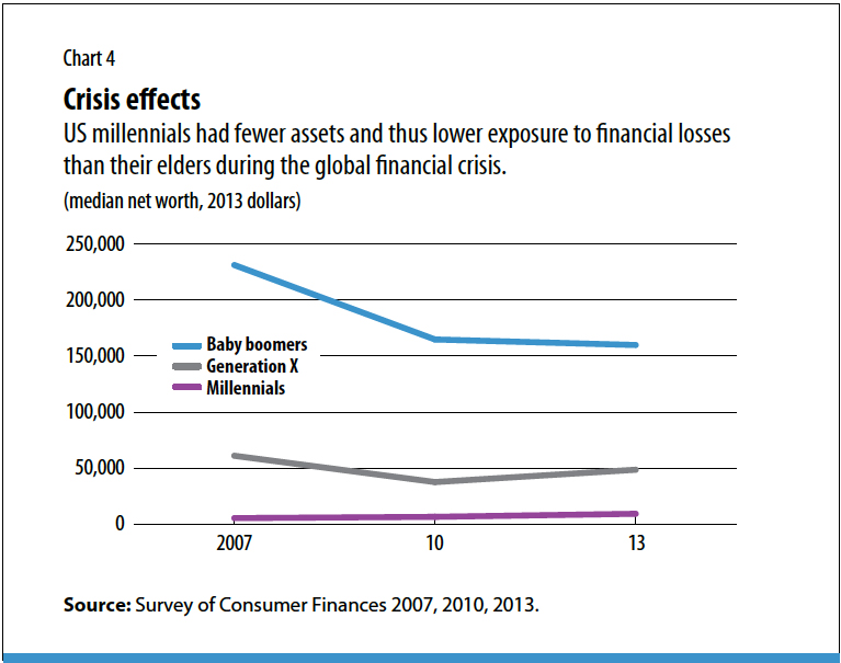 Millennials, Gen Xers, and baby boomers all experienced the economic turmoil of the Great Recession. But because each cohort was at a different stage, the recession affected each differently. Compared with the two previous generations, millennials had fewer assets and thus lower exposure to financial losses during the crisis (see Chart 4). And after the Great Recession, millennials and Gen Xers began accumulating wealth again, while baby boomer net worth has stalled. Although millennials have less wealth than their baby boomer parents at the same age, the median millennial’s net worth increased more than 40 percent between 2010 and 2013, and they still have much of their working lives ahead to recover further and continue to accumulate wealth. If millennials do eventually decide to buy homes or put away a nest egg for retirement, they may have the chance to begin when markets are on an upward trajectory, allowing them to reap the gains of future economic growth.
