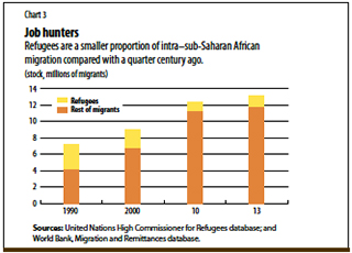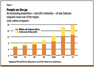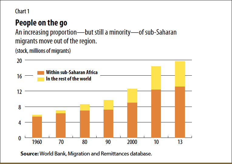 In 2013, about 20 million sub-Saharan Africans, twice the 1990 number, were living outside their own country—13 million of whom had migrated within the region (see Chart 1).