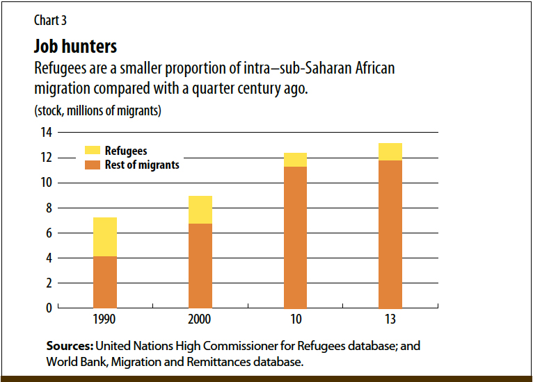 The number of refugees—people fleeing war or persecution—is much lower in Africa since 1990, both within and outside the region. About half of migrants were refugees in 1990, down to about 10 percent by 2013 thanks to fewer large-scale conflicts in the region (see Chart 3).