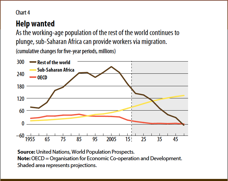 These demographic trends and persistently large income gaps between sub-Saharan African and advanced economies will likely drive more migration. The ratio of sub-Saharan African migrants to the total population of their new homes in OECD countries is projected to increase sixfold, from about 0.4 percent in 2010 to 2.4 percent by 2050—through a combination of more migration from the region and slow expected population growth in the OECD.