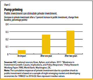 Policymakers can boost investment directly, through public investment, and indirectly, by encouraging private, including foreign direct, investment, and by undertaking measures to improve overall growth prospects and the business climate. Doing so directly through greater public investment in infrastructure and workers would help raise demand in the short term, increase potential output in the long term, and improve the environment for private investment and trade. Public investment would also help close income gaps, as targeted by the United Nations Sustainable Development Goals and, under the right conditions, has the potential to stimulate private investment (see Chart 3).