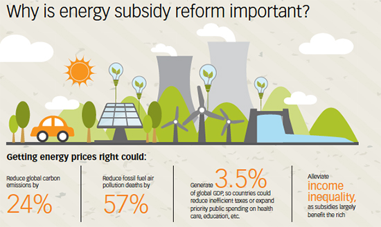 Energy subsidies are policy measures that aim to lower the cost of energy consumption. In 2015, these subsidies amounted to 6.5 percent of global GDP, or roughly $5.3 trillion. Subsidies have many negative economic and environmental effects, and they primarily benefit the wealthiest households. Despite this, they have proved difficult to reduce or remove. But in recent years a few factors may have shifted the balance to provide incentive for reform: subdued growth since the global financial crisis, lower energy prices since a sharp decline in mid-2014, and pledges to reduce greenhouse gas emissions signed by 190 countries as part of the December 2015 Paris Agreement.