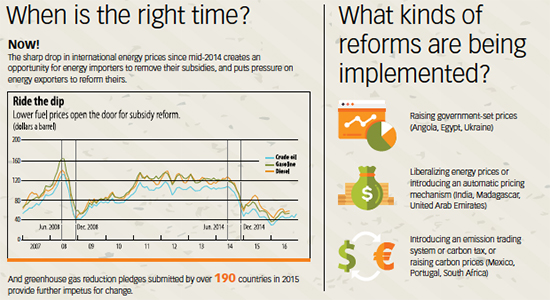 In addition, energy subsidy reforms that are driven by long-term considerations, such as addressing environmental concerns or reducing oil dependency, are likely to be more durable than those driven by short-term factors, such as budget deficits resulting from lower oil revenues.