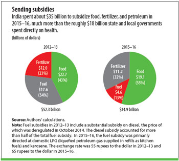 For example, commodities that harm health can be taxed while those that are beneficial can be subsidized. In India, subsidies for food, fertilizer, and petroleum—three commodities that can have large direct and indirect health effects—totaled about $52 billion in 2012–13 and $35 billion in 2015–16 (see chart). The subsidies in 2015–16 accounted for about twice what state and local governments spent directly on health. Taxes and tariffs can improve general population health when levied on commodities—such as alcohol, tobacco, salt, and sugar—that can harm people’s health. Subsidies on commodities such as sugar, diesel, kerosene, and coal could be reduced and the savings redirected to nutritious food and clean energy sources. Governments could subsidize liquefied natural gas, in place of kerosene for cooking, and fruit, dairy, and protein sources for nutrition (see table).