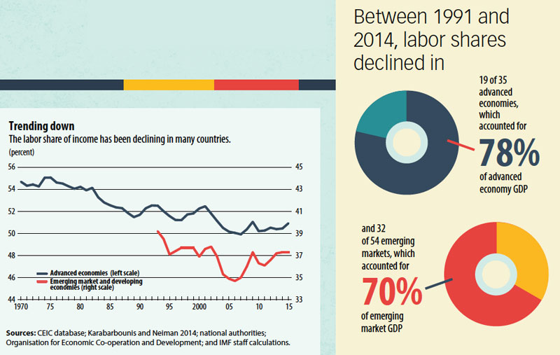 The main factors behind this phenomenon vary across countries. In advanced economies, about half of the decline is attributable to technology as rapid advances in information technology have led to automation of many occupations. In emerging markets, global integration—specifically participation in global value chains—is the key driver. Global integration has lifted millions from poverty by raising productivity, growth, and living standards, and it has also shifted emerging market and developing economies toward more capital-intensive activities. Labor-intensive jobs in advanced economies are frequently offshored to emerging markets, where the same tasks are relatively capital intensive. And this relocation raises capital shares in both sending and receiving economies.