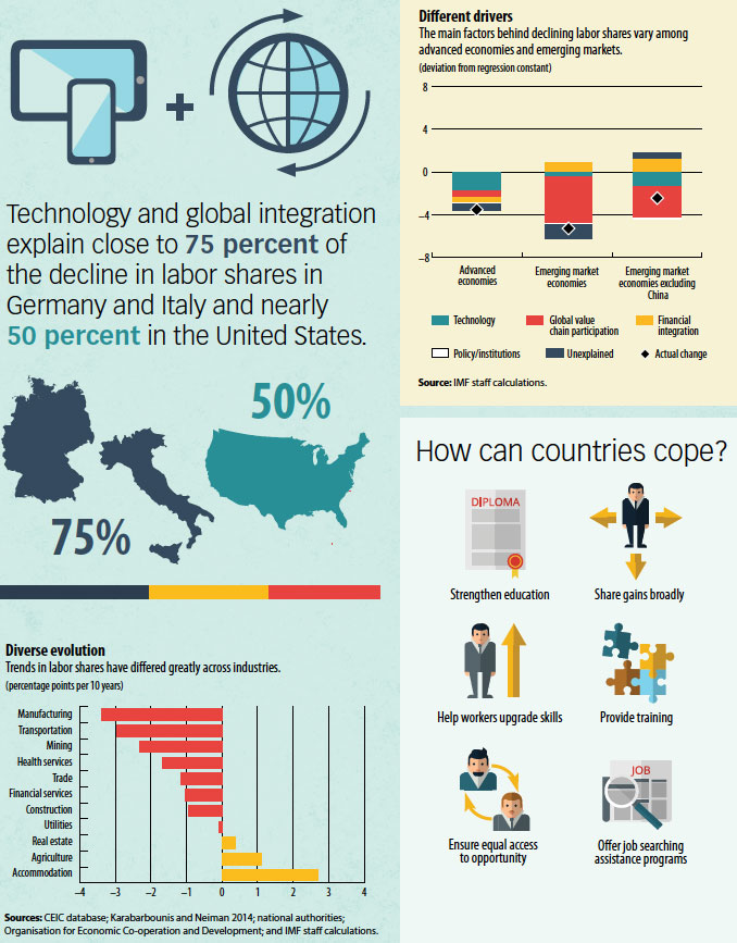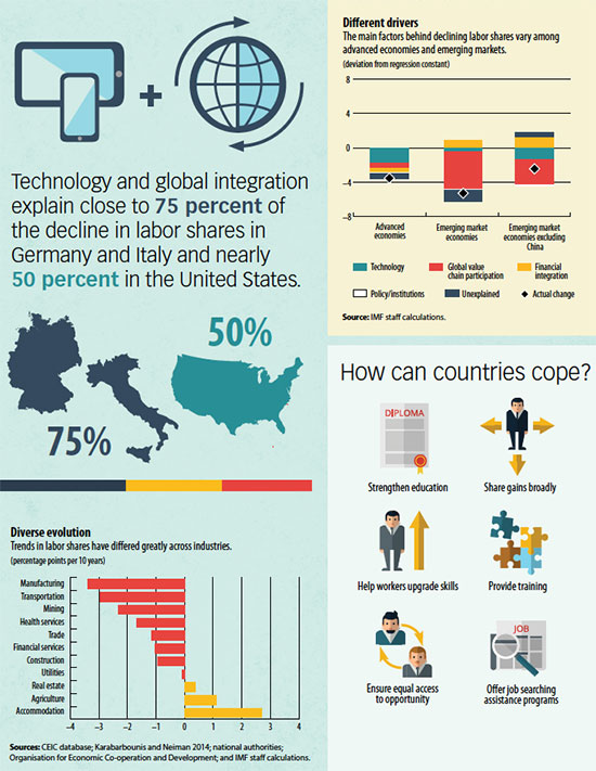In emerging markets, the decline in labor shares does not necessarily require policy intervention, as the effects of global integration have been largely beneficial. Advanced economies facing disruptions from technological progress, however, should invest in education, skills upgrades, and policies that help match displaced workers with new jobs. Policies that promote development of more advanced skills would also help prepare workers in both advanced economies and emerging markets for the potential disruptions of the future.