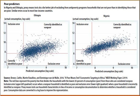 For two of the countries in our study, Ethiopia and Nigeria, the chart shows the relationship between actual consumption and the scores using a standard proxy means test. In both countries, there is a strong positive relationship between the proxy means test scores and actual consumption; most of those deemed not to be poor based on the score are correctly classified. But there are substantial exclusion errors, strikingly so for Ethiopia, where 95 percent of the poor are identified as nonpoor (compared with 55 percent for Nigeria). But for both countries, and indeed for all those in our study, the commonly used proxy variables are clearly not doing a very good job of distinguishing poor households.