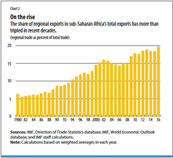 Integration across sub-Saharan Africa has been most notable through trade, steadily increasing in intensity over time: since the 1980s the share of regional exports in total exports has more than tripled (see Chart 2). Sub-Saharan Africa now has the highest share of intraregional trade integration among the world’s emerging market and developing economies, followed by the Middle East and North Africa and emerging and developing Asia.