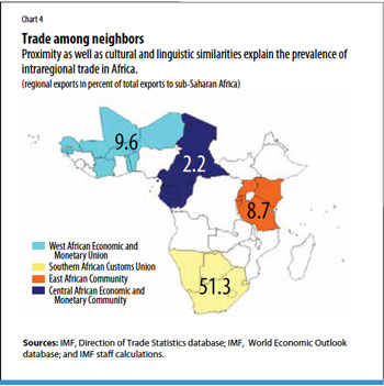 Throughout the continent there are other small pockets of intensive intraregional integration, though the import shares are relatively small compared with those of the big players and with total sub-Saharan African intraregional exports. Countries with intensive intraregional integration tend to be smaller and to import significant shares of their neighbors’ GDP, and can thus be a substantial source of spillovers at the subregional level. This is particularly true in the case of west African countries such as Burkina Faso, Ghana, and Mali, which are large destination markets for exports worth more than 1 percent of GDP for some of their trading partners.