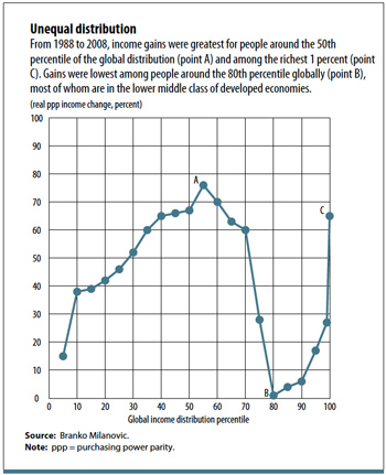 The 2013 article, cowritten with Christoph Lakner, delineated what became known as the “elephant curve” because of its shape (see chart). It shows that over the 20 years that Milanovic calls the period of “high globalization,” huge increases in wealth were unevenly distributed across the world. The middle classes in developing economies—mainly in Asia—enjoyed a dramatic increase in incomes. So did the top 1 percent of earners worldwide, or the “global plutocrats.” Meanwhile, the lower middle classes in advanced economies saw their earnings stagnate.