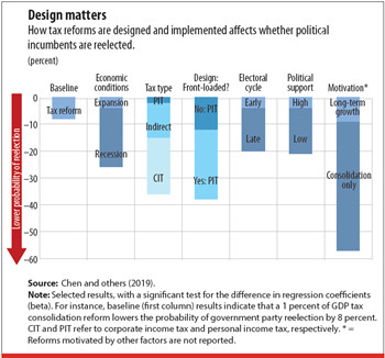 Reform design in terms of the timing of tax measures and the electoral cycle can shape political costs. Voters tend to penalize governments more for announcing front-loaded reform efforts that result in higher tax payments immediately than for back-loaded measures that entail a gradual increase in tax liabilities.