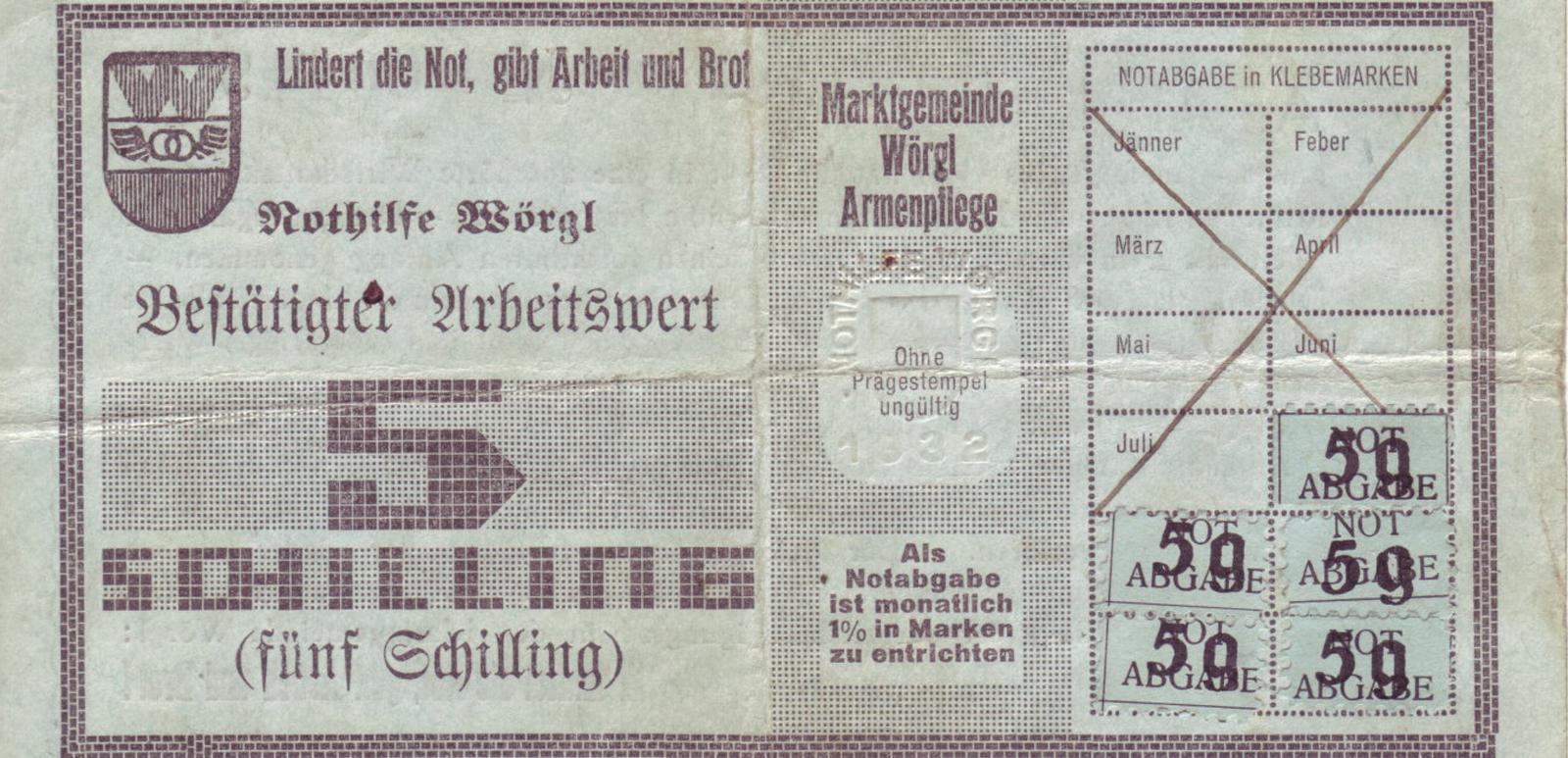 A 5 schilling note issued in the Austrian city of Wörgl in the 1930s, showing the monthly stamps required for preserving its value, which served to stimulate circulation and worked like a “hoarding tax.”