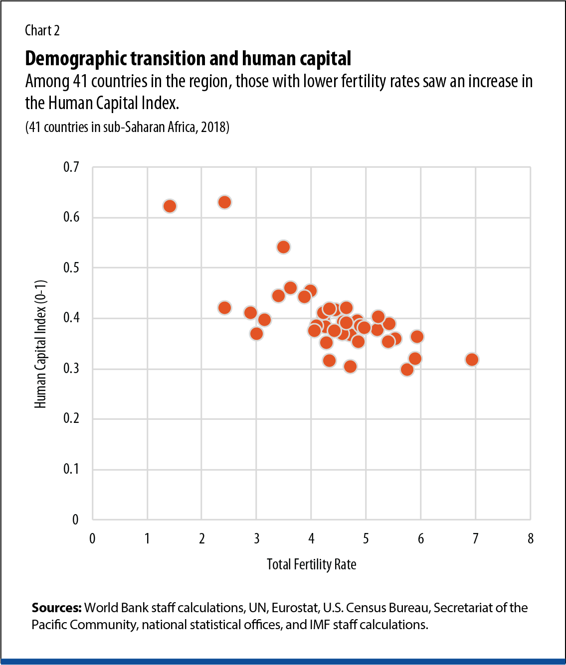 Across the region, higher HCI has coincided with lower fertility (Chart 2) (UNFPA, 2020; World Bank, 2018). Notably, Kenya’s contraceptive prevalence rate rose from 4 percent in 1978 to 56 percent in 2019. In Ethiopia, the fertility rate for adolescent girls fell from 116 births per 1,000 in 1960 to sixty-three in 2019 (UNFPA, 2020).
