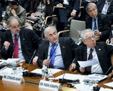 IMF's Strauss-Kahn (c) with IMFC's Padoa-Schioppa (r) and IMF First Deputy Managing Director Lipsky at panel's meeting in Washington (IMF photo)