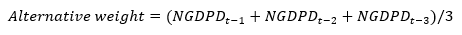 A. In the Table 1 of WEO, the “World Output” (series NGDP_RPCH in published dataset) is calculated using PPP GDP as weights as discussed in other questions. The “World Growth Based on Market Exchange Rates” under Memorandum section (series NGDP_RPCHMK in published dataset) is based on an alternative weight, calculated as the three-year trailing average of nominal GDP in U.S. dollars (NGDPD):
