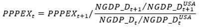 The PPP exchange rate in the WEO database comes from a calculation that starts with the PPPs reported by the ICP for 2011–17, which is then extended backwards and forwards by the growth in relative GDP deflators (the deflator of a country divided by the deflator of the United States).