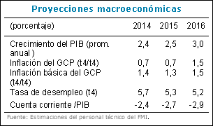 2. Empleo e inflación. El mercado laboral ha mostrado una recuperación sostenida durante el último año, y varios indicadores sugieren que las perspectivas del empleo vuelven a los niveles previos a la crisis. Sin embargo, el desempleo de larga duración, la reducida participación laboral y los elevados niveles de trabajo a tiempo parcial revelan que sigue habiendo capacidad ociosa en el mercado laboral. En general, los indicadores salariales muestran solo un crecimiento tibio. En combinación con la apreciación del dólar, la caída de los precios mundiales de los bienes transables y la reducción de los costos de la energía, se prevé que la inflación del gasto de consumo personal (GCP) caiga en los próximos meses a un 1,2% para fines de septiembre. La inflación debería comenzar a aumentar en el curso del año, pero alcanzaría el objetivo a mediano plazo de 2% fijado por la Reserva Federal recién para mediados de 2017.