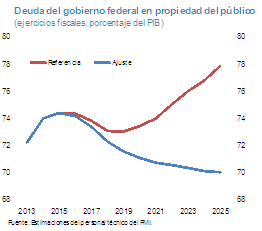 17. Ajustes a mediano plazo. Las finanzas públicas de Estados Unidos siguen transitando un sendero insostenible. Se prevé que la deuda y el déficit federales se reducirán en los próximos años, pero con la constelación actual de políticas, esa tendencia descendente no durará. Para 2019, la deuda federal comenzará a aumentar una vez más, a medida que comiencen a sentirse las presiones de gasto relacionadas con el envejecimiento de la población y las tasas de interés lleguen a niveles más normales. Por esa razón, se proyecta que la deuda federal aumentará al 78% del PIB en 2025.