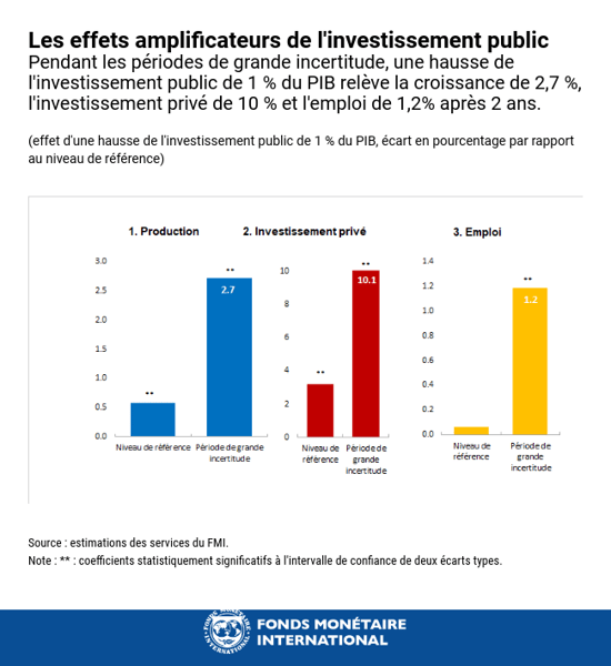À cet égard, l’investissement public est appelé à jouer un rôle central. La nouvelle édition du Moniteur des finances publiques montre qu’une hausse des investissements publics dans les pays avancés et les pays émergents contribuerait à relancer l’activité après le coup d’arrêt infligé par la crise, à la fois le plus grave et le plus brutal de l’histoire économique contemporaine. Une telle initiative permettrait en effet de créer des millions d’emplois directs à court terme et ouvrirait la voie à la création indirecte de millions d’emplois supplémentaires à plus long terme. Une augmentation de l’investissement public égale à 1 % du PIB renforcerait la confiance dans le redémarrage de l’activité et dynamiserait le PIB de 2,7 %, l’investissement privé de 10 % et l’emploi de 1,2 %, à condition que les projets retenus portent sur des investissements haute qualité et que les niveaux préexistants de dette publique et privée n’affaiblissent pas la réponse du secteur privé à cette relance.