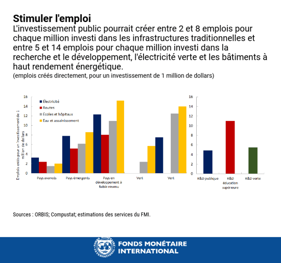 L’investissement public peut être un vecteur majeur de la reprise. Il est ainsi possible de créer entre 2 et 3 emplois directs pour chaque million de dollars investi dans des projets d’infrastructures traditionnelles, et entre 5 et 14 emplois directs pour chaque million de dollars investi dans la recherche et le développement, l’électricité verte et des bâtiments à haut rendement énergétique.