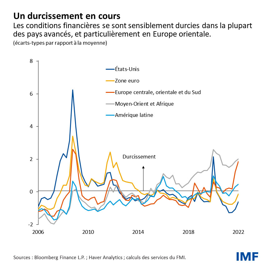 Depuis le début de l’année, les conditions financières se sont sensiblement durcies presque partout dans le monde, et en particulier en Europe orientale. Alors que l’inflation augmente, les relèvements attendus des taux d’intérêt ont provoqué un resserrement notable dans les pays avancés dans les semaines qui ont suivi l’invasion russe de l’Ukraine. Malgré ce resserrement, les conditions financières sont proches de leurs moyennes historiques et les taux d’intérêt restent accommodants dans la plupart des pays.