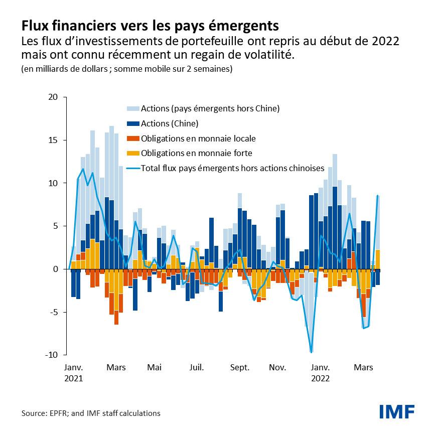 Les pays émergents et préémergents sont désormais confrontés à des risques plus élevés de sorties de capitaux, la situation étant différente selon que les pays sont importateurs ou exportateurs de produits de base. Dans un contexte d’incertitude géopolitique, l’effet conjugué d’un resserrement des conditions financières extérieures et de la normalisation de la politique monétaire de la Réserve fédérale américaine (qui a procédé en mars au premier relèvement de ses taux et dont la réduction du bilan devrait être plus rapide) va vraisemblablement accroître le risque de fuite des capitaux.