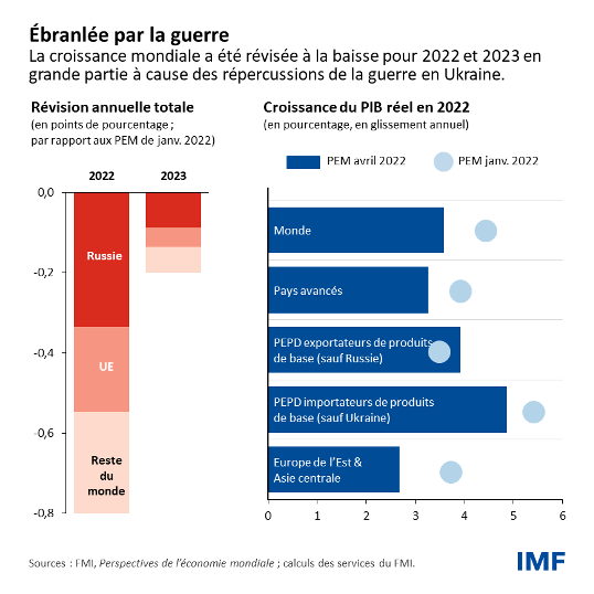 Par rapport à nos prévisions de janvier, nous avons revu à la baisse notre chiffre pour la croissance mondiale, désormais de 3,6 % pour 2022 et 2023, en raison des répercussions directes de la guerre en Ukraine et des sanctions contre la Russie ; il est en effet prévu que les deux pays connaissent une forte contraction. Les perspectives de croissance de l’Union européenne pour cette année ont été revues à la baisse de 1,1 point de pourcentage du fait des conséquences indirectes de la guerre, ce qui en fait le deuxième plus grand contributeur à la révision globale à la baisse.