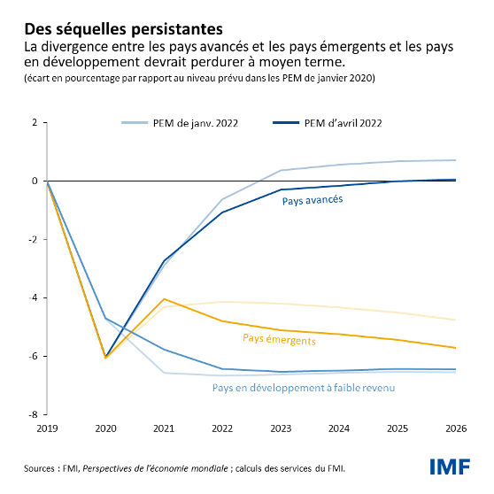 Les perspectives à moyen terme sont revues à la baisse pour tous les groupes, à l’exception des pays exportateurs de produits de base qui bénéficient de la forte augmentation des prix de l’énergie et des denrées alimentaires. La production agrégée des pays avancés mettra plus de temps à retrouver sa trajectoire antérieure à la pandémie. En outre, la divergence constatée en 2021 entre les pays avancés et les pays émergents et les pays en développement devrait persister, ce qui laisse penser que la pandémie aura laissé des séquelles permanentes.