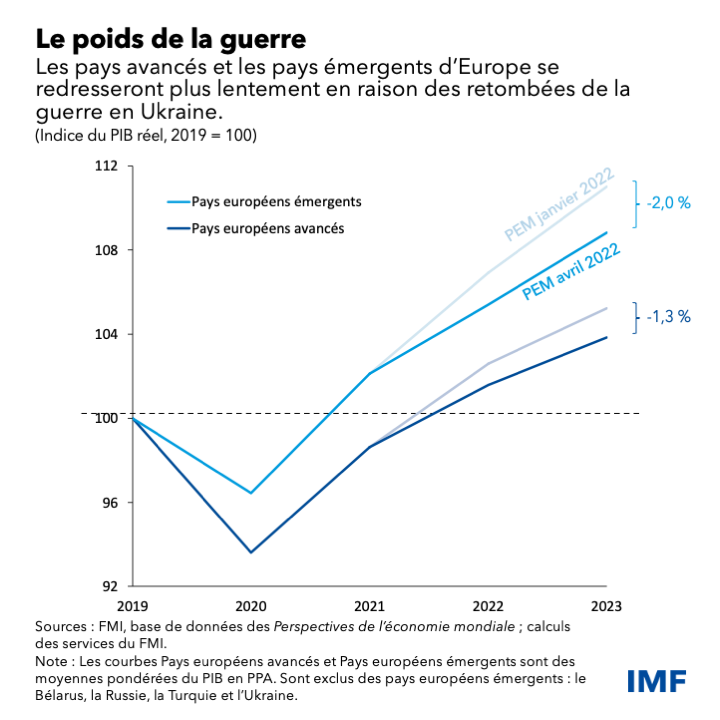 Les prévisions de croissance en Europe ont été revues à la baisse dans la dernière édition des Perspectives économiques régionales. Ainsi, les taux de croissance respectifs des pays avancés et des pays émergents hors Ukraine et Russie en 2022 ont été abaissés de 1 point de pourcentage et de 1,5 point de pourcentage par rapport aux projections de janvier et s’établissent désormais à 3 % et 2,7 %. Plusieurs grands pays comme l’Allemagne, la France, l’Italie et le Royaume-Uni devraient enregistrer une croissance très faible, voire négative, durant deux trimestres consécutifs cette année. Enfin, l’activité économique devrait se contracter de 8,5 % en Russie et de 35 % en Ukraine.