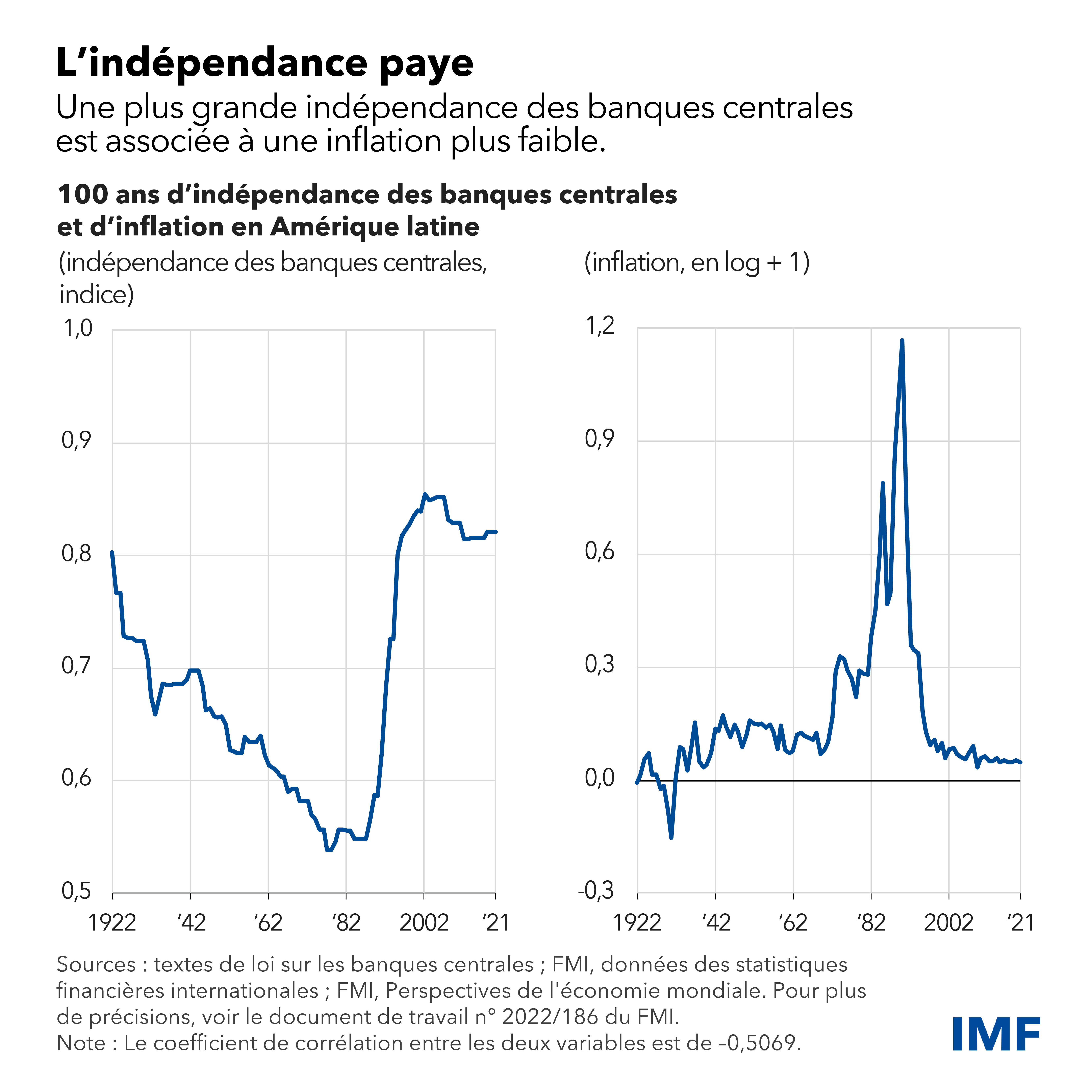 Une autre étude du FMI répertoriant les résultats de 17 banques centrales d’Amérique latine au cours des 100 dernières années examine différents facteurs, parmi lesquels l’indépendance dans les prises de décisions, la clarté du mandat et la possibilité qu’elles soient contraintes de consentir des prêts à l’État. Là encore, il s’avère qu’un plus grand degré d’indépendance est associé à de bien meilleurs résultats sur le plan de l’inflation.