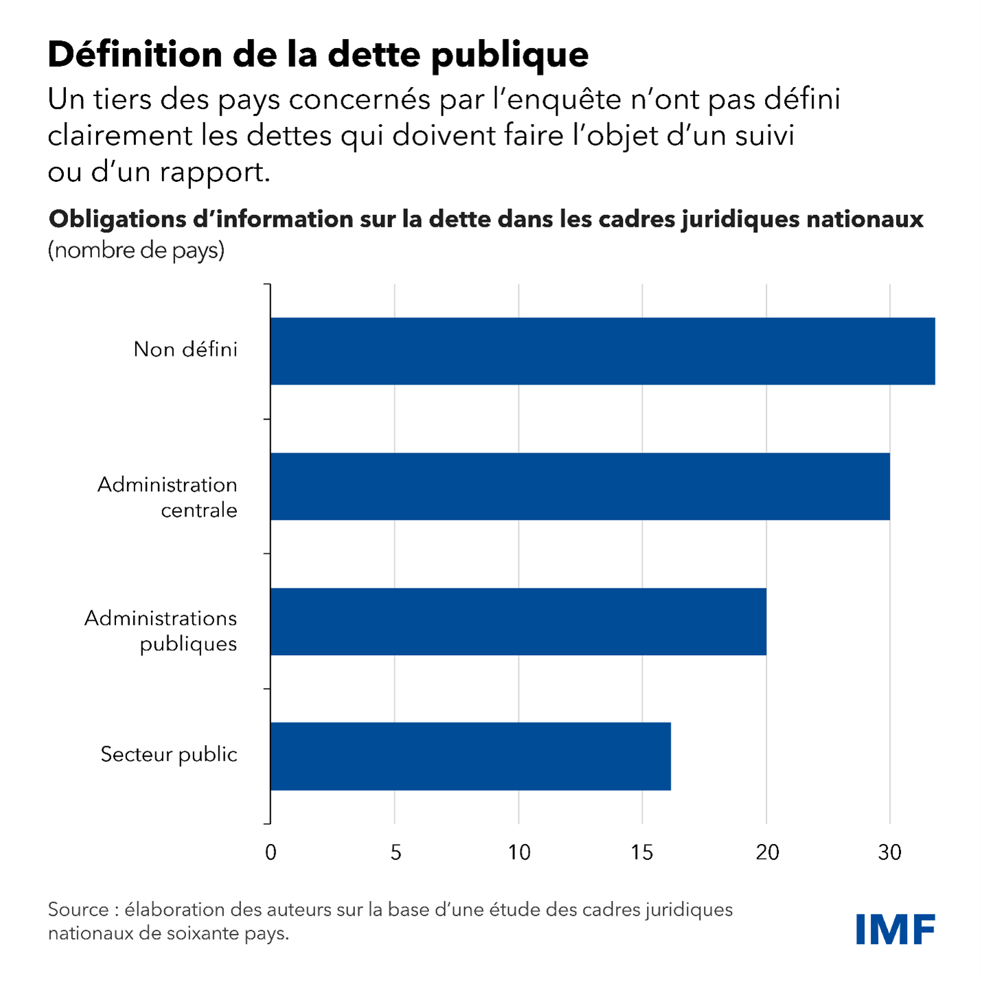 L’Équateur en offre un bon exemple : en 2020, le pays a procédé à une réforme juridique afin de garantir que les instruments de financement à court terme — tels que les titres ou les bons du Trésor d’une durée inférieure à un an — soient pris en compte dans les calculs et les statistiques de la dette. Parmi les exemples à suivre, citons les définitions juridiques utilisées au Ghana, en Jamaïque, au Rwanda, en Thaïlande et au Viet Nam, qui englobent de multiples types d’instruments de dette.
