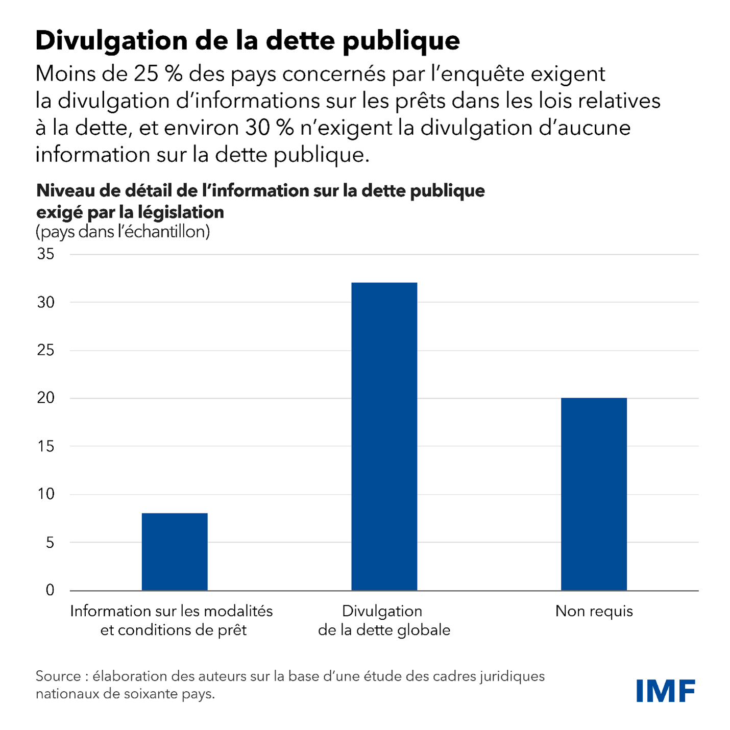 Des lois bien conçues compliquent la dissimulation des dettes. Toutefois, ces lois ne sont pas en nombre suffisant, malgré les avantages avérés qu’elles procurent. Compte tenu de la nécessité absolue de la transparence, les pays et leurs partenaires internationaux doivent insister sur les réformes visant à améliorer les cadres juridiques nationaux, ce qui profitera à la fois aux emprunteurs, aux créanciers légitimes et au système dans son ensemble. Plus que jamais, il est indispensable de ne ménager aucun effort.