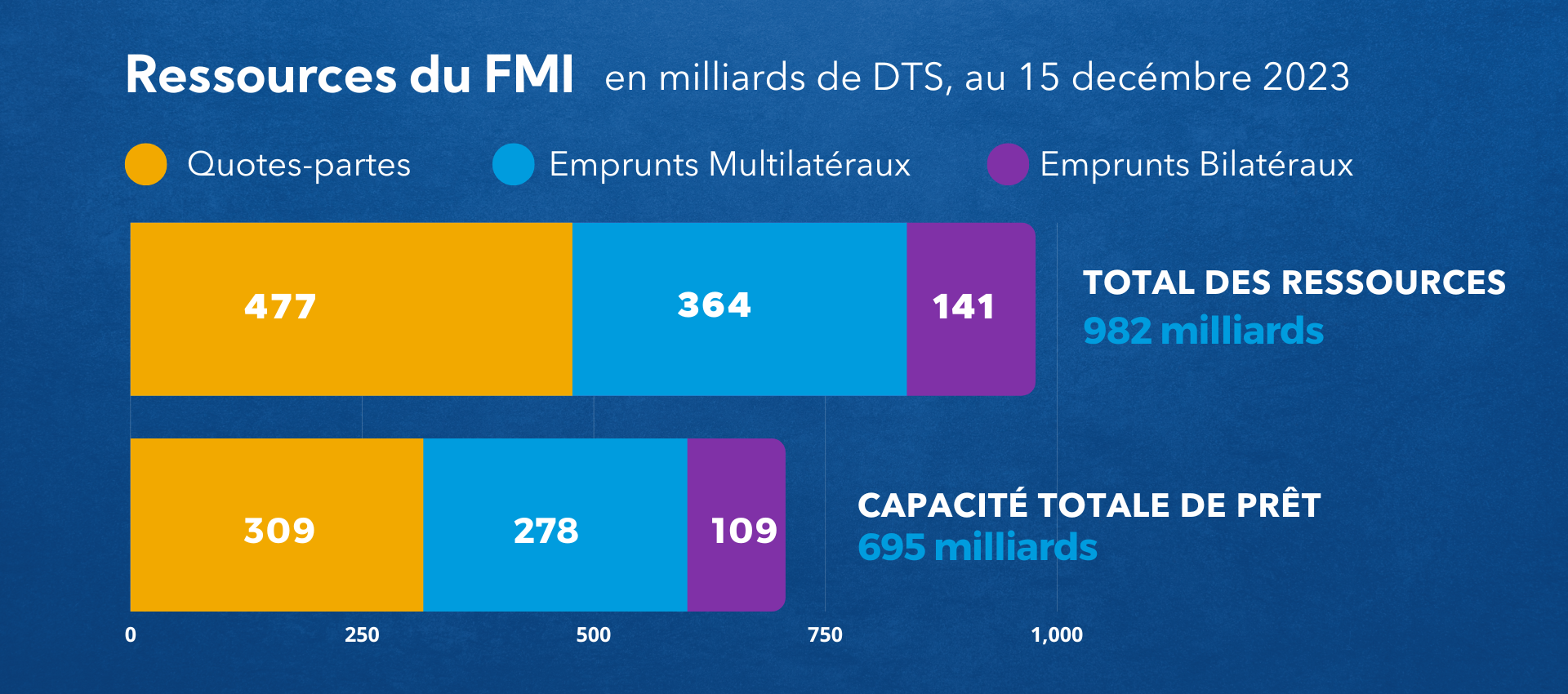 Actuellement estimé à environ 982 milliards de DTS, le total des ressources dont le FMI dispose constitue, à la mi-décembre 2023, une capacité de prêt d’environ 695 milliards de DTS (environ 932 milliards de dollars).
