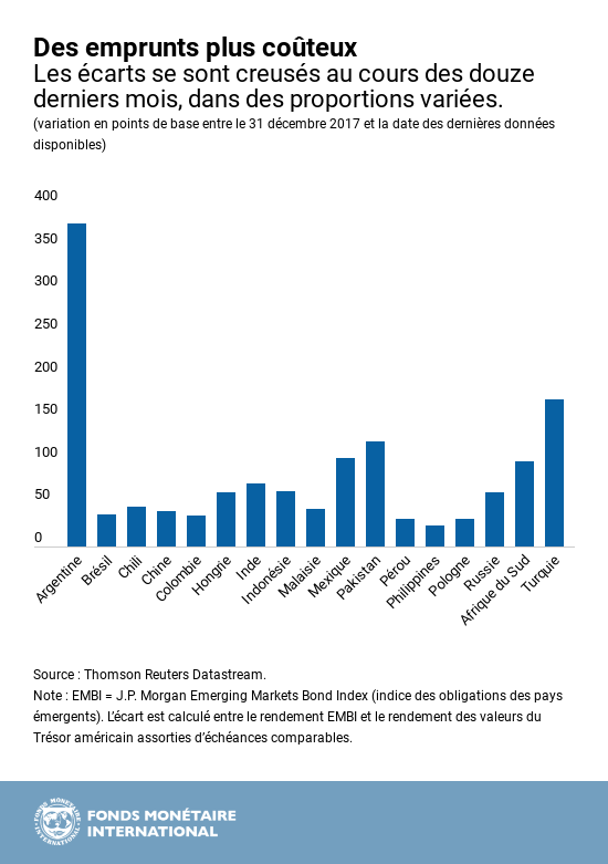 Plusieurs pays émergents vulnérables se retrouvent dans une situation délicate à cause de l’augmentation de la valeur du dollar et du moindre appétit des investisseurs financiers internationaux pour le risque. Le coût de l’emprunt extérieur a augmenté pour la plupart de ces pays, mais dans des proportions très variables.