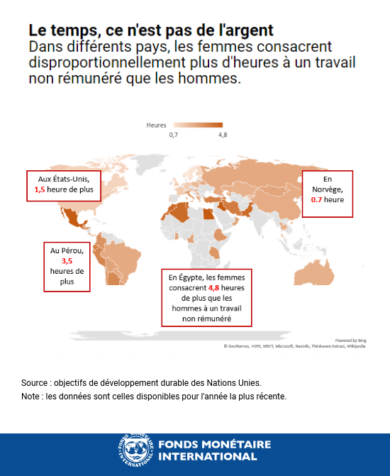En Norvège, l'écart est faible : 3, 7 heures de travail non rémunéré pour les femmes et 3 heures pour les hommes. À l'autre extrême, en Égypte, les femmes consacrent 5,4 heures par jour à ces tâches, contre seulement 35 minutes pour les hommes. Aux États-Unis, ces chiffres sont de 3,8 pour les femmes et 2,4 pour les hommes.