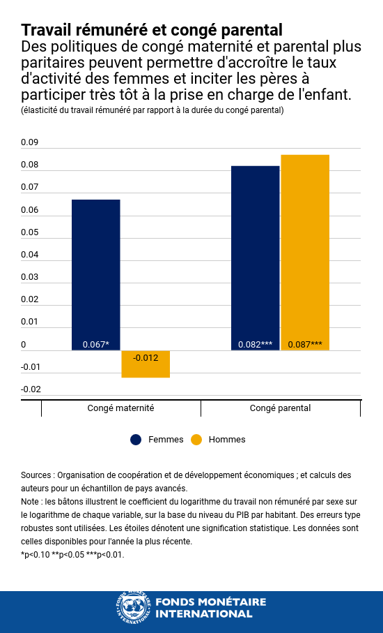 Faire en sorte que les politiques de congé maternité et parental soient plus paritaires peut accroître la participation des femmes au marché du travail en facilitant leur retour au travail et en incitant les pères à participer très tôt à la prise en charge de l’enfant. La politique islandaise en matière de congé parental est un bon exemple à cet égard : chaque parent a droit à trois congés, dont la durée est fixée à neuf mois.