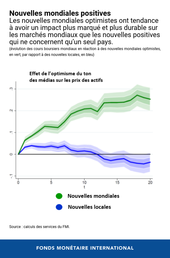 Nous avons constaté que les changements soudains du sentiment exprimé dans les nouvelles influent fortement sur les prix des actifs partout dans le monde, ce qui confirme que le ton utilisé dans les médias est en général un excellent indicateur du sentiment des investisseurs. L’étude met aussi en relief le rôle des nouvelles étrangères (et des investisseurs étrangers) par opposition à celui des nouvelles locales (et des investisseurs locaux) dans l’évolution des prix des actifs locaux. (Par nouvelles étrangères, nous entendons les nouvelles concernant de multiples pays et de leurs relations mutuelles par opposition aux nouvelles locales qui ne concernent qu’un seul pays.)