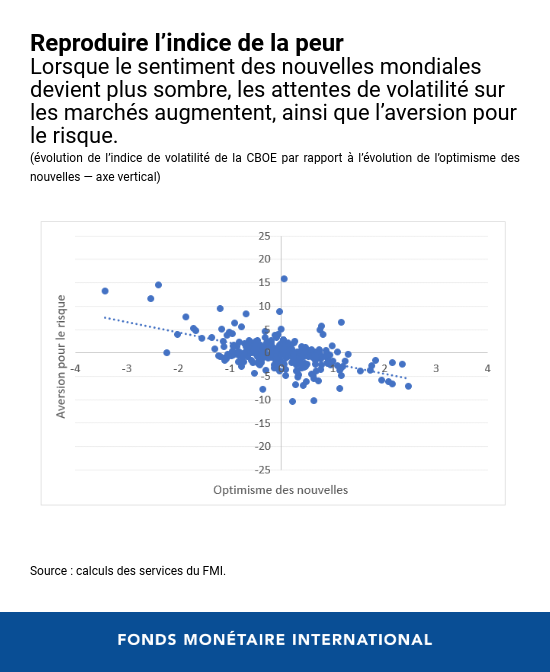 De façon importante, l’étude démontre aussi l’utilité des nouvelles technologies (notamment les mégadonnées et l’exploration de textes) dans le travail quotidien des institutions. Ainsi, l’humeur émanant des nouvelles publiées partout dans le monde jour après jour (« l’indice du sentiment fondé sur les nouvelles mondiales ») donne des résultats comparables à d’autres indicateurs populaires de l’aversion mondiale pour le risque comme l’indice de volatilité de la CBOE ou l’indice VIX, qui témoigne des attentes de volatilité des marchés au cours des 30 prochains jours et qu’on surnomme souvent « l’indice de la peur ». Toutefois, l’indice fondé sur les nouvelles prédit avec plus d’exactitude que l’indice VIX les fluctuations à venir des prix des actifs internationaux.