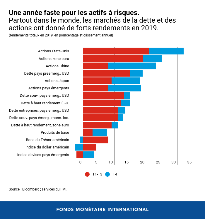 Bien qu’une certaine volatilité ait été observée récemment, 2019 a été une année exceptionnelle pour de nombreux marchés d’actifs à risques dans le monde entier. Les indices boursiers ont grimpé d’un peu plus de 30 % aux États-Unis, de près de 25 % en Europe et en Chine, et de plus de 15 % dans les pays émergents et au Japon. La dette souveraine des pays émergents, la dette à rendement élevé aux États-Unis et la dette des entreprises dans les pays émergents ont toutes offert des rendements de plus de 12 %. Le quatrième trimestre 2019 a été particulièrement vigoureux en Chine et dans les pays émergents.