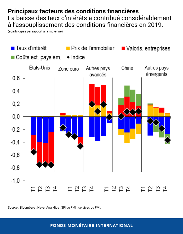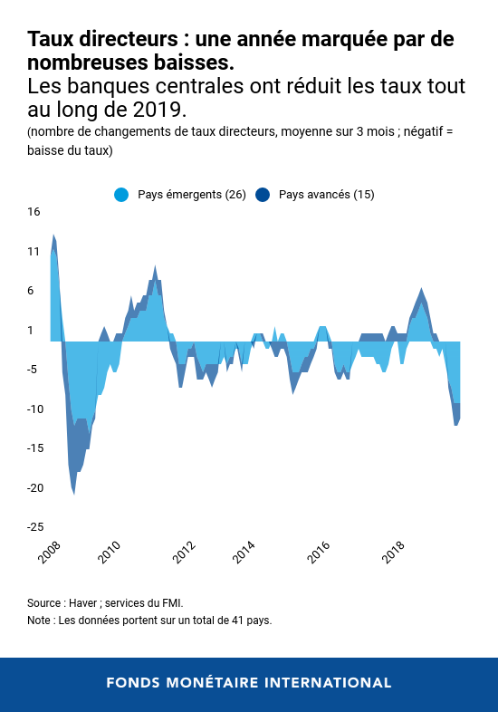 Qu’est-ce qui permet d’expliquer cette forte valorisation des actifs à risques ? L’un des facteurs déterminants de cette hausse a été l’assouplissement synchronisé de la politique monétaire tout au long de l’année 2019. Les banques centrales du monde entier, en particulier la Banque fédérale de réserve des États-Unis et la Banque centrale européenne, ont répondu aux inquiétudes grandissantes au sujet de l’économie mondiale par un assouplissement de leur politique monétaire, en baissant les taux et en prenant des mesures non conventionnelles. Depuis la crise financière mondiale de 2008, jamais le nombre total de baisses des taux directeurs dans les pays avancés et émergents n’a été aussi élevé.