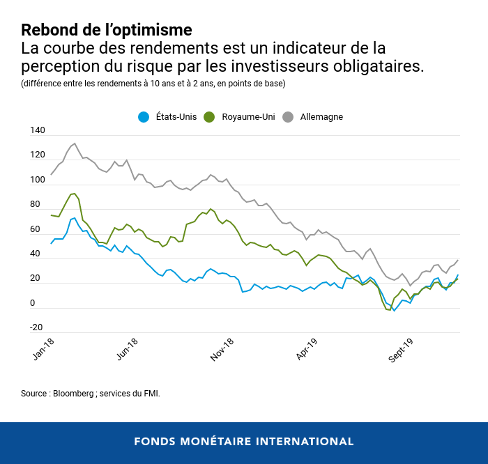 La pente de la courbe des rendements des emprunts ’d’État à deux et dix ans, l’un des indicateurs les plus fréquemment utilisés pour évaluer les risques de ralentissement pesant sur l’économie, dénote un retour de la confiance sur les marchés. Si la courbe s’était nettement aplatie depuis le début de l’année 2018, témoignant de l’inquiétude croissante des investisseurs au sujet des perspectives économiques, elle a commencé à se redresser au cours du quatrième trimestre 2019 aux États-Unis, au Royaume-Uni et en Allemagne, ce qui semble indiquer un certain regain d’optimisme sur les marchés.