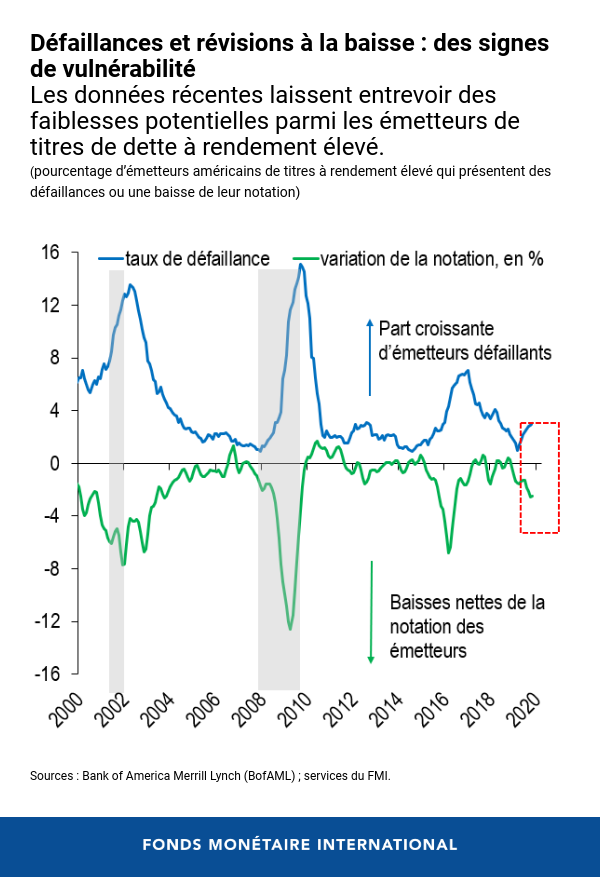 Cependant, à plus longue échéance, la croissance pourrait être compromise à moyen terme par le fait que l’assouplissement des conditions financières au niveau mondial intervient si tard dans le cycle économique, et par l’accumulation continue de facteurs de vulnérabilité financière, comme la survalorisation des actifs sur certains marchés et dans certains pays, l’augmentation de l’endettement ou encore l’abondance des flux de capitaux à destination des pays émergents. Par exemple, les taux de défaillance ont augmenté sur le marché des titres à haut rendement aux États-Unis, ainsi que sur les marchés chinois national et offshore des obligations d’entreprises, bien qu’ils étaient bas au départ. En outre, si les écarts de taux des pays émergents (c’est-à-dire la différence entre les rendements de la dette souveraine des pays émergents et un rendement de référence, comme celui des bons du Trésor des États-Unis) sont très réduits pour la plupart des pays, dans certains cas précis la vente de titres de dette de pays émergents s’apparente à un financement de détresse, même s’il ne semble y avoir aucune contagion pour le moment.