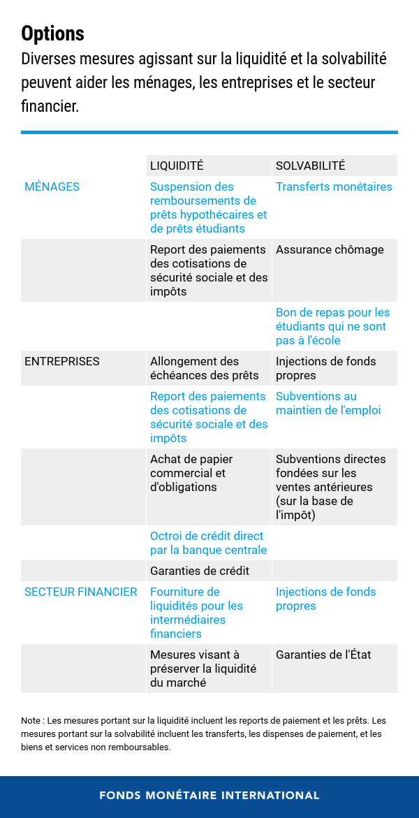 Les mesures de soutien aux ménages, aux entreprises et au secteur financier porteront à la fois sur leur liquidité (offre de crédit, report des obligations financières) et leur solvabilité (transfert de ressources réelles ; voir tableau).