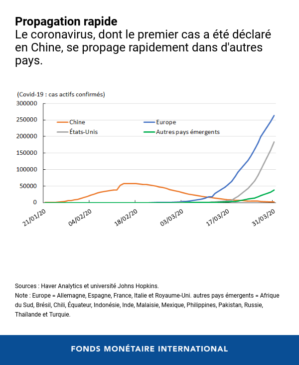 La Chine a été le premier pays à ressentir la pleine force de la maladie, avec plus de 60 000 cas actifs confirmés à la mi-février. Des pays européens comme l’Italie, l’Espagne et la France se trouvent maintenant en phase aigüe de l'épidémie, suivis par les États-Unis, où le nombre de cas actifs augmente rapidement. Dans beaucoup de pays émergents et de pays en développement, l'épidémie semble juste commencer.