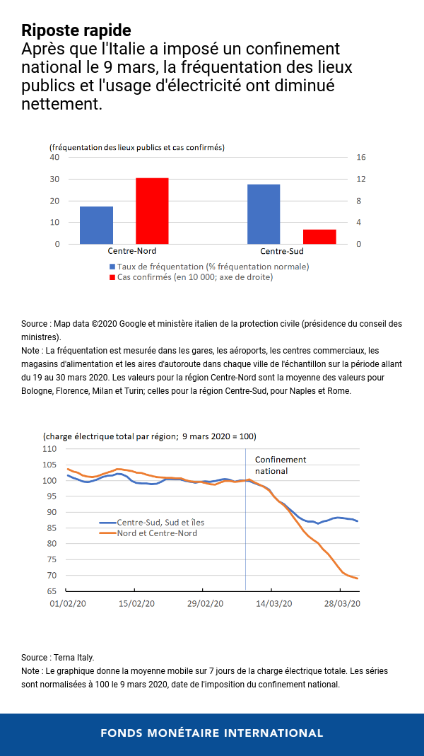 En Italie, premier pays européen durement touché, le gouvernement a imposé un confinement national le 9 mars pour juguler la propagation du virus. En conséquence, la fréquentation des lieux publics et l'usage d'électricité ont diminué considérablement, surtout dans les régions du Nord où les taux d’infection sont bien plus élevés.