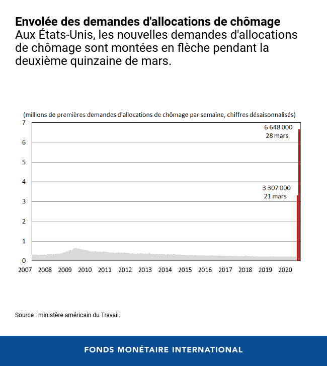 Aux États-Unis, la vitesse et l’intensité des conséquences économiques de la pandémie sont sans précédent. Au cours des deux dernières semaines de mars, près de 10 millions de personnes ont déposé des demandes d’allocations de chômage. On n’a jamais observé d'augmentation aussi prononcée et alarmante, même pas au pire de la crise financière mondiale en 2009.